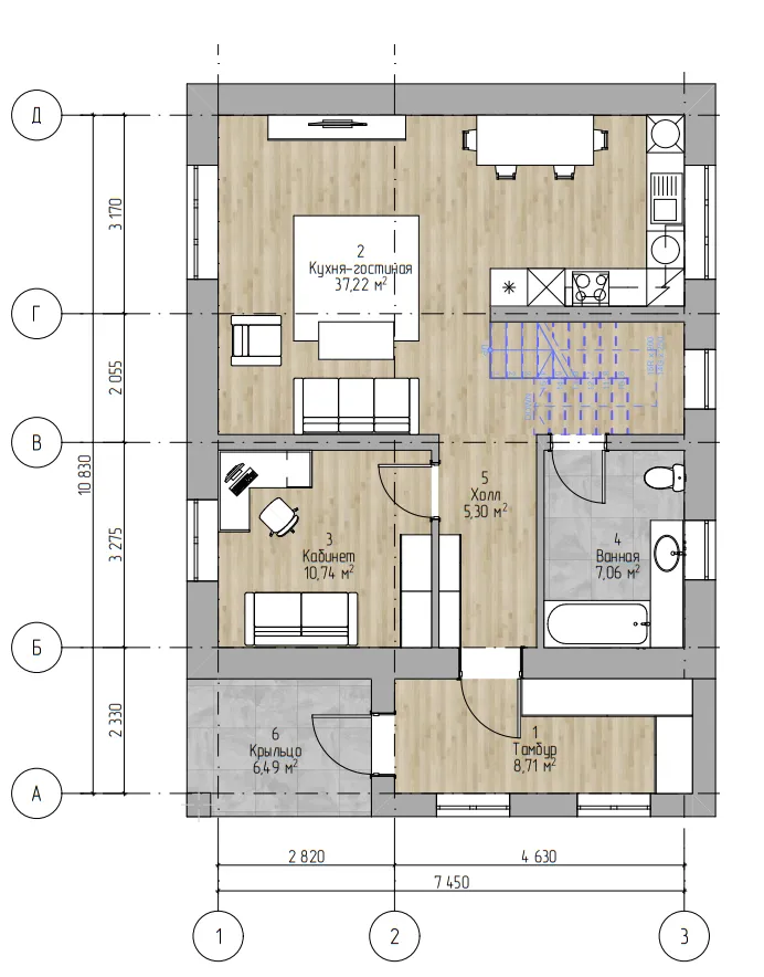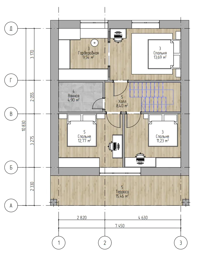 С балконом над входной группой и пристраиваемой террасой, 35 м2;
